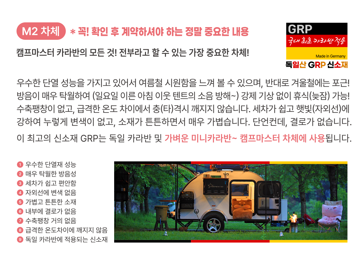 독일산 신소재 GRP 차체를 적용하여단열 및 방음이 우수하고 안전합니다